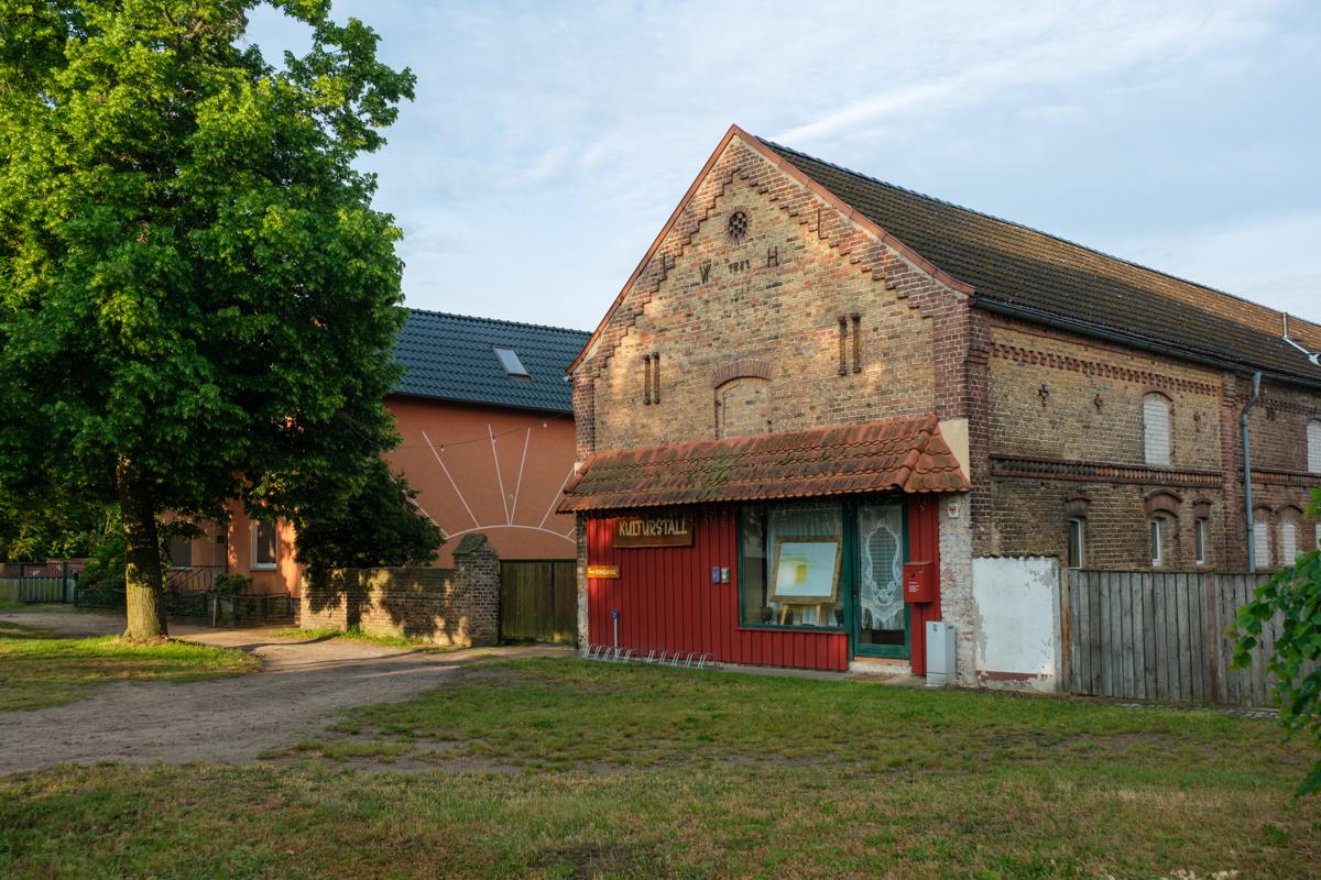 Nachdem ich die Dosse überquert habe – erst über einen ruhigen Nebenarm mit dichtem Algenteppich, danach über einen lebendig sprudelnden Abschnitt mit kleinen Stromschnellen – erreiche ich bald den historischen Kern des Ortes. Die Fachwerkhäuser um die evangelische Kreuzkirche gruppieren sich malerisch um den zentralen Platz und bilden einen stimmungsvollen Kontrast zum bisherigen Straßenbild.