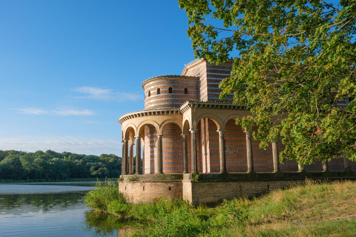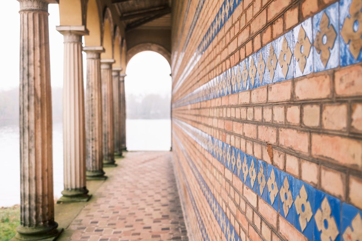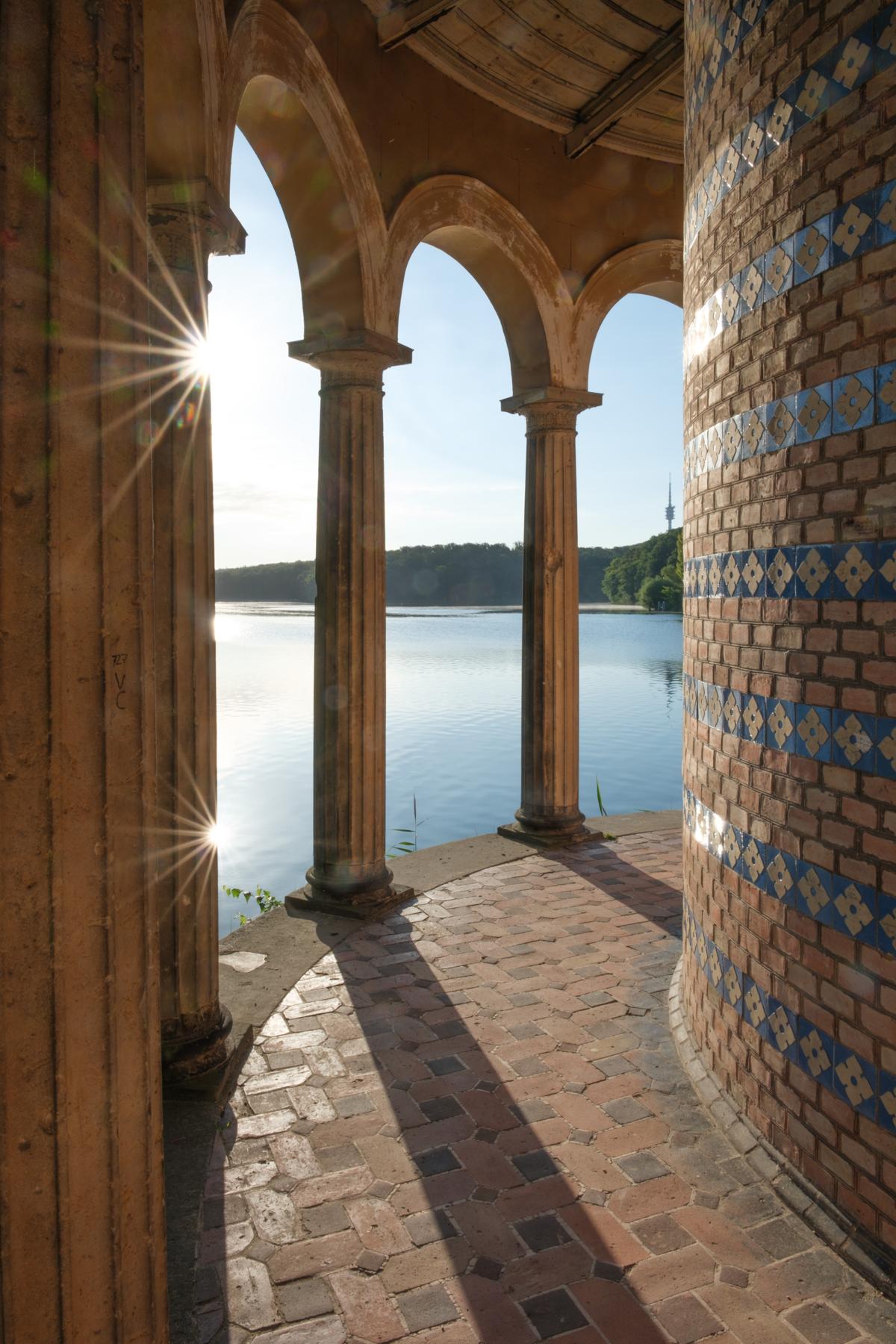 Wo sich die Havel am Jungfernsee weit ausdehnt, liegt der Schlosspark Sacrow, und direkt am Wasser erhebt sich die Heilandskirche. Von der Ferne wirkt sie wie ein Schiff, das am Ufer ruht, und ihr Anblick erinnert an eine kleine Kirche in Oberitalien. Warm-orange leuchten die Ziegel des Bauwerks, das von einer offenen Kolonnade umgeben ist und sich harmonisch in die Landschaft einfügt.