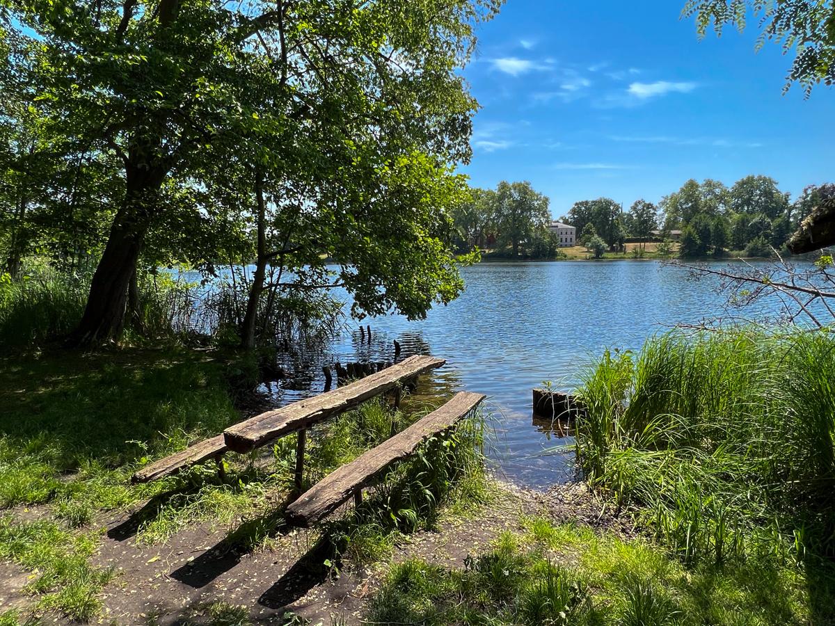 Durch das Blätterdach des Uferbewuchses hat man einen Blick auf das gegenüberliegende Landgut Stober.