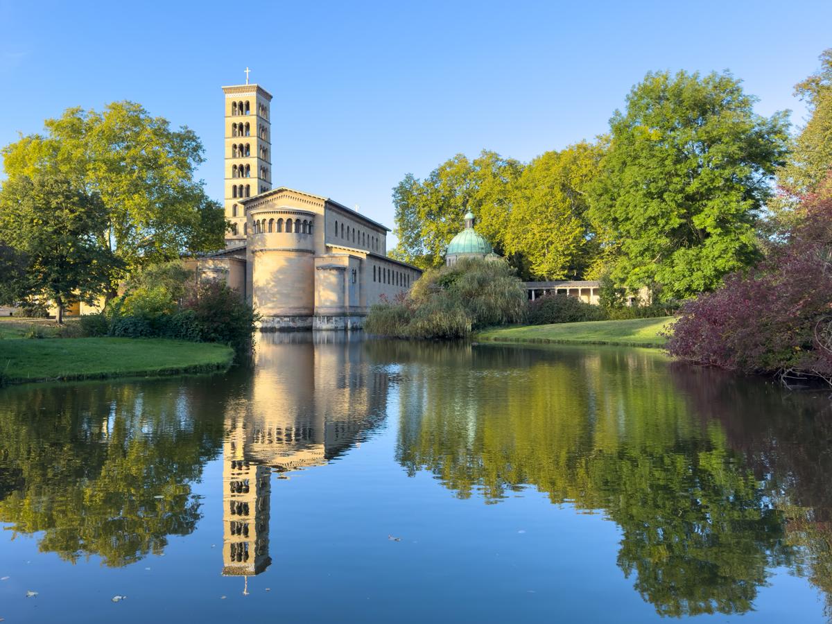 Über die Schopenhauerstraße erreichen wir den Osteingang des Parks Sanssouci. Im Wasser spiegelt sich die von Schinkel entworfene Friedenskirche Potsdam, und schon hier zeigt sich der Zauber dieser Tour: die Verbindung von Natur und Architektur.